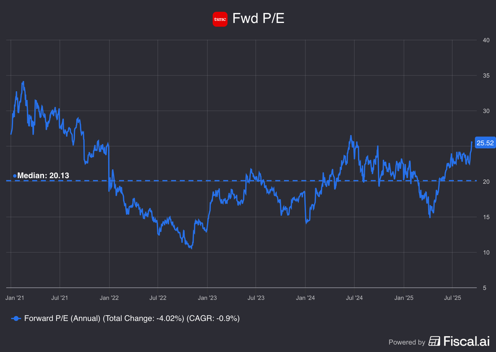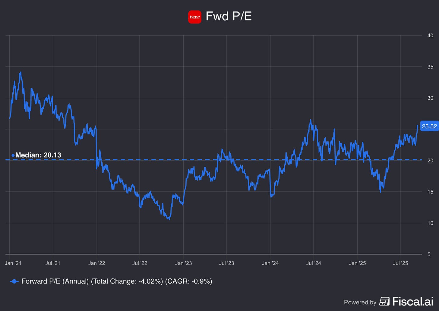 TSMC’s forward P/E is trading well above its historical median, suggesting the stock may currently be overvalued based on this metric.