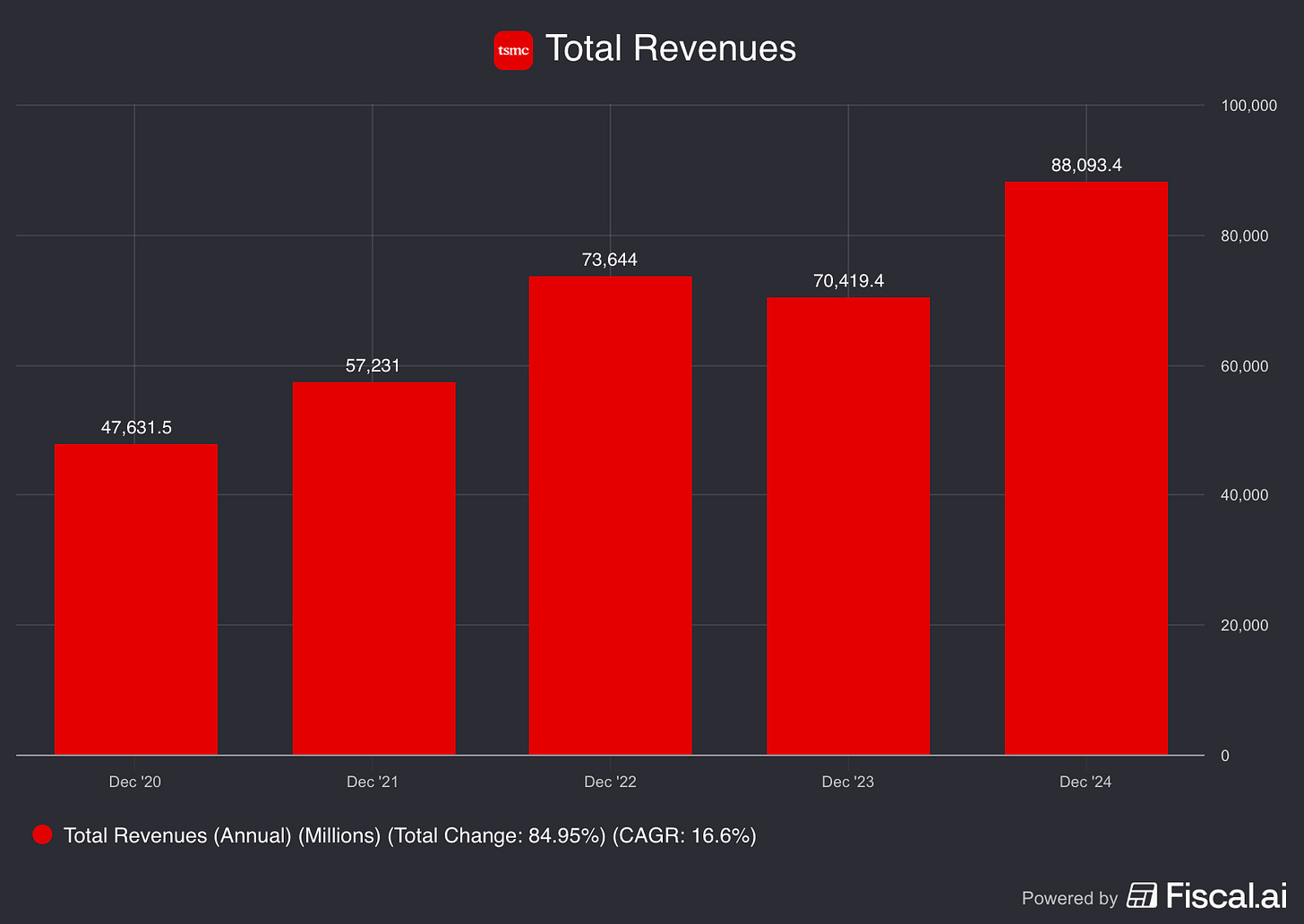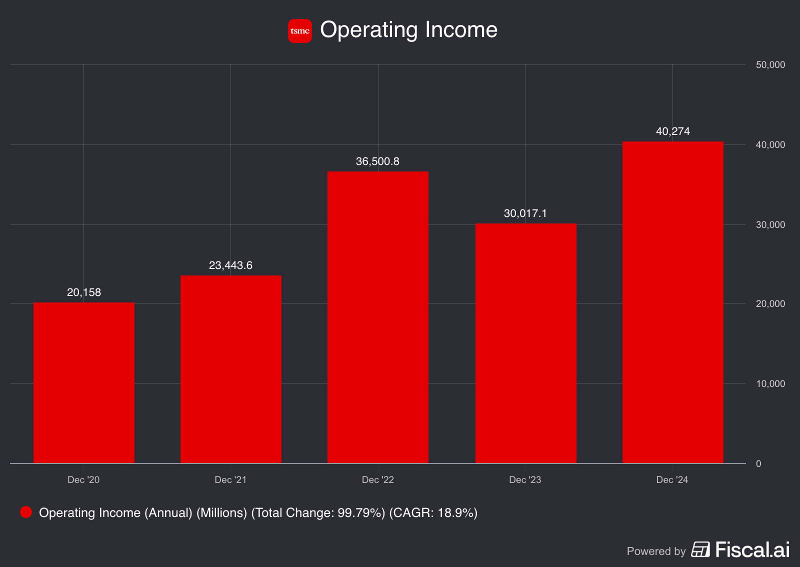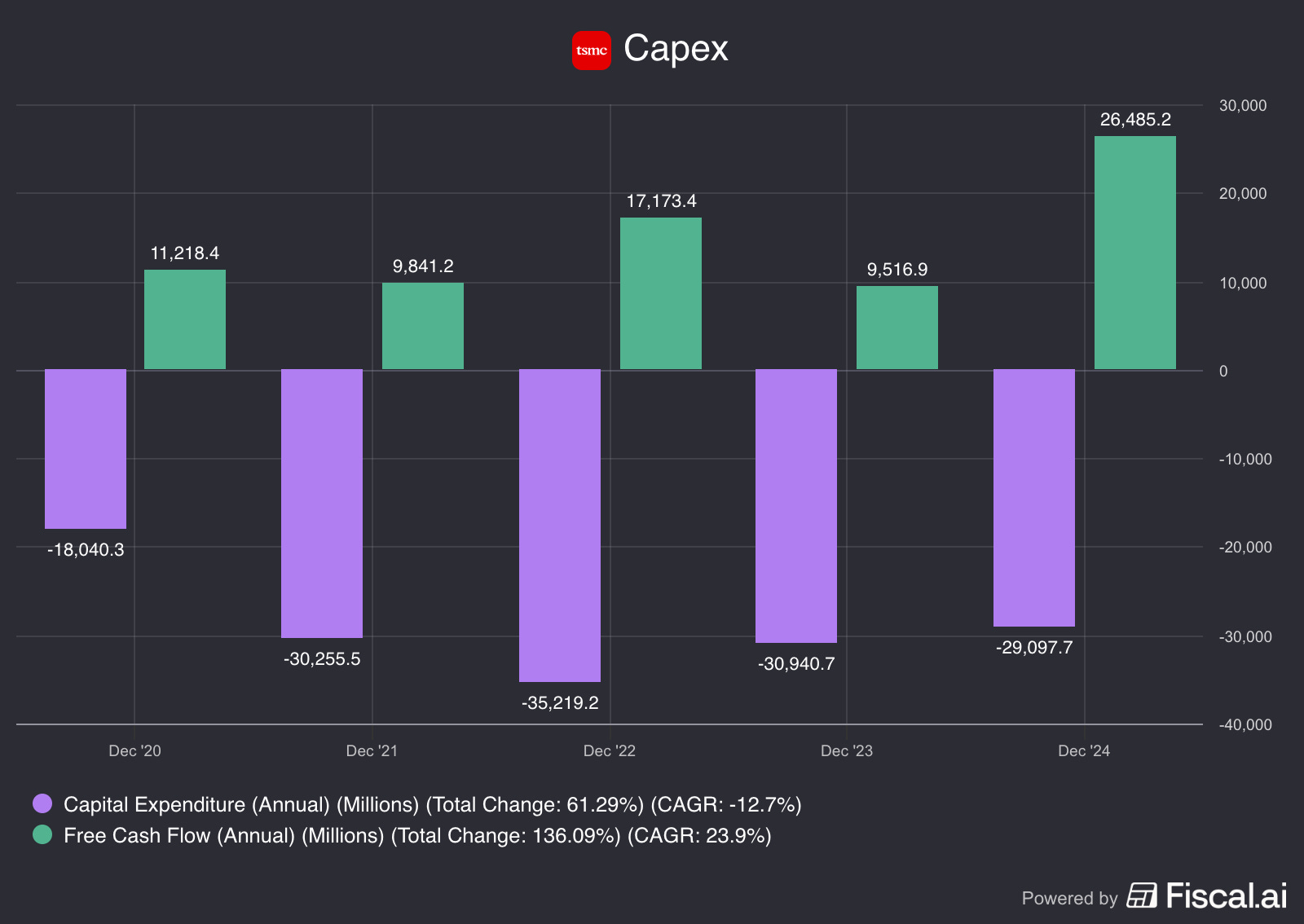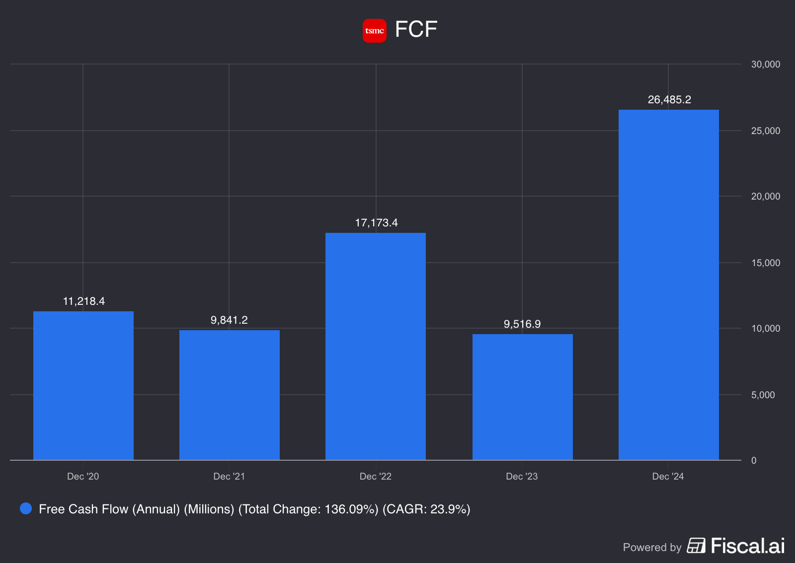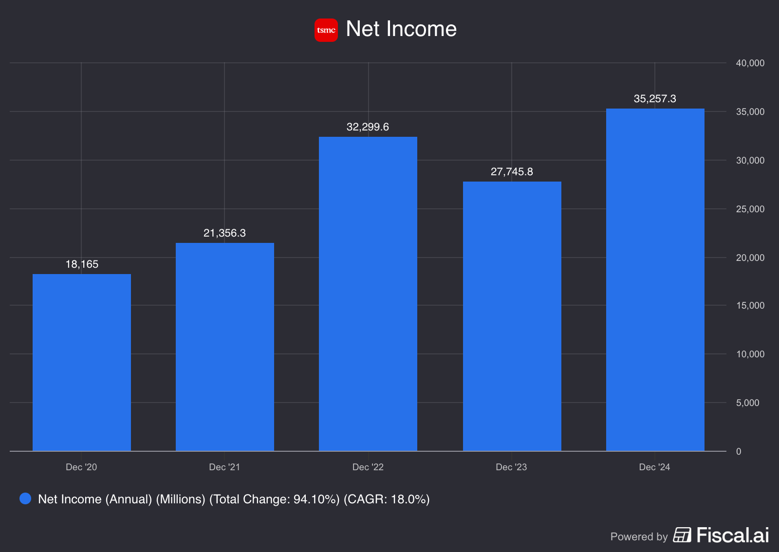 TSMC’s net income trajectory shows a strong and stable growth path. From $18,165M in 2020, to over $35,257 million. Management seems to know how they can keep increasing their bottom line.