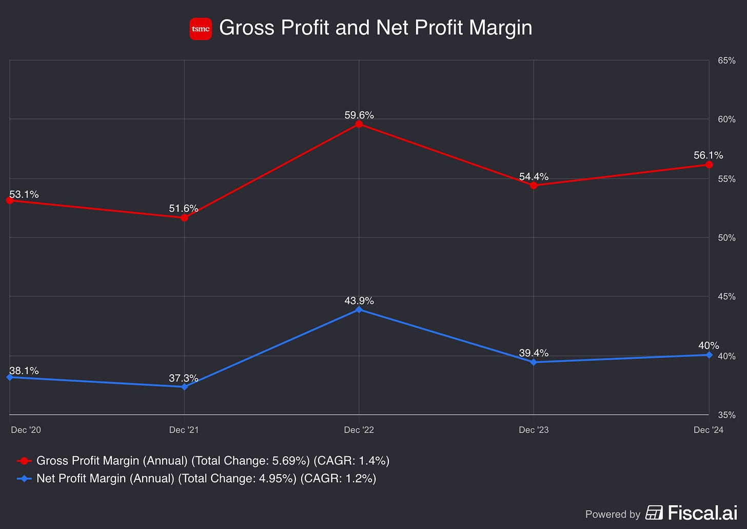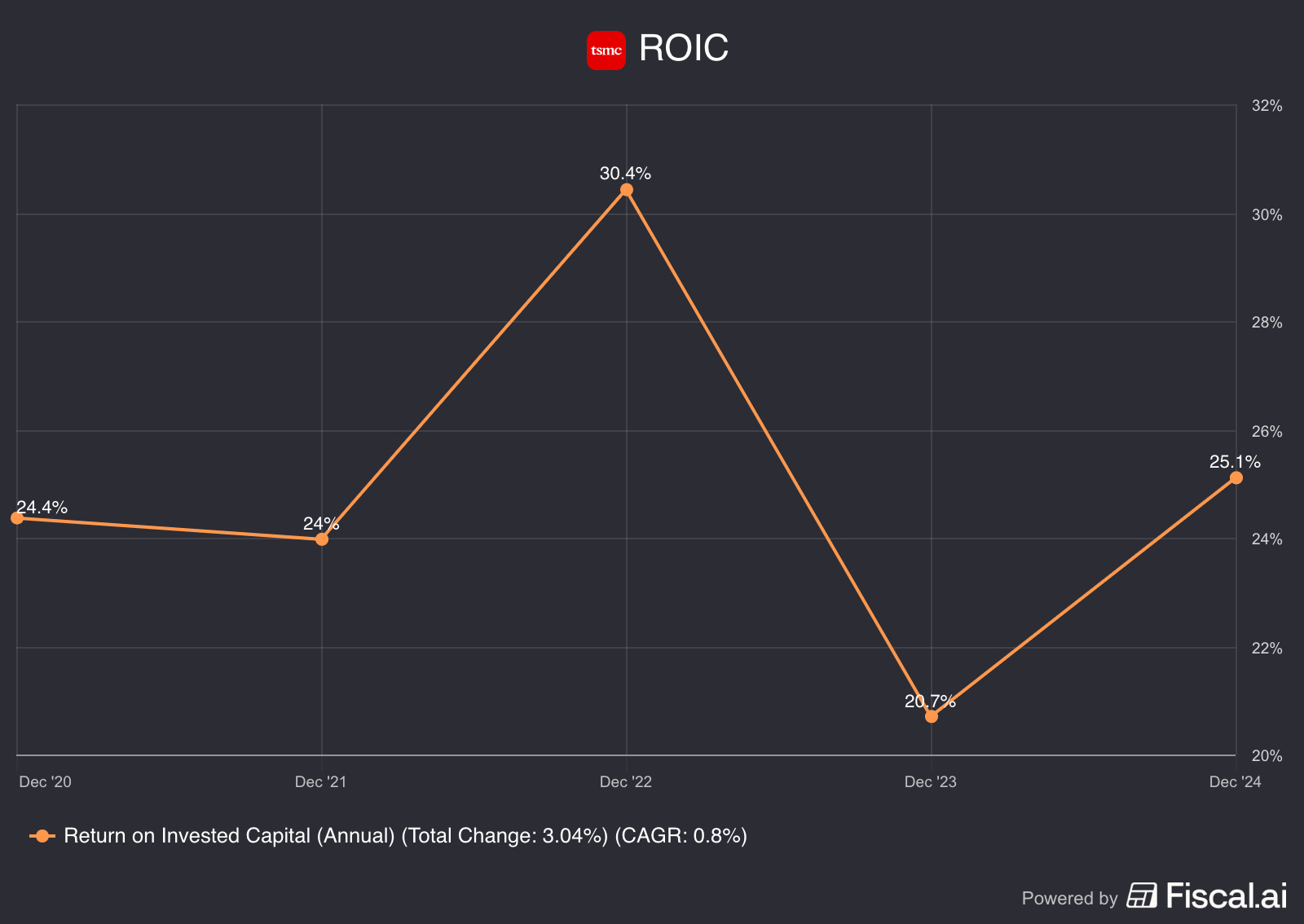 Over the past few years, TSMC’s return on invested capital (ROIC) has increased a lot. This indicates that the company is making good investment decisions.