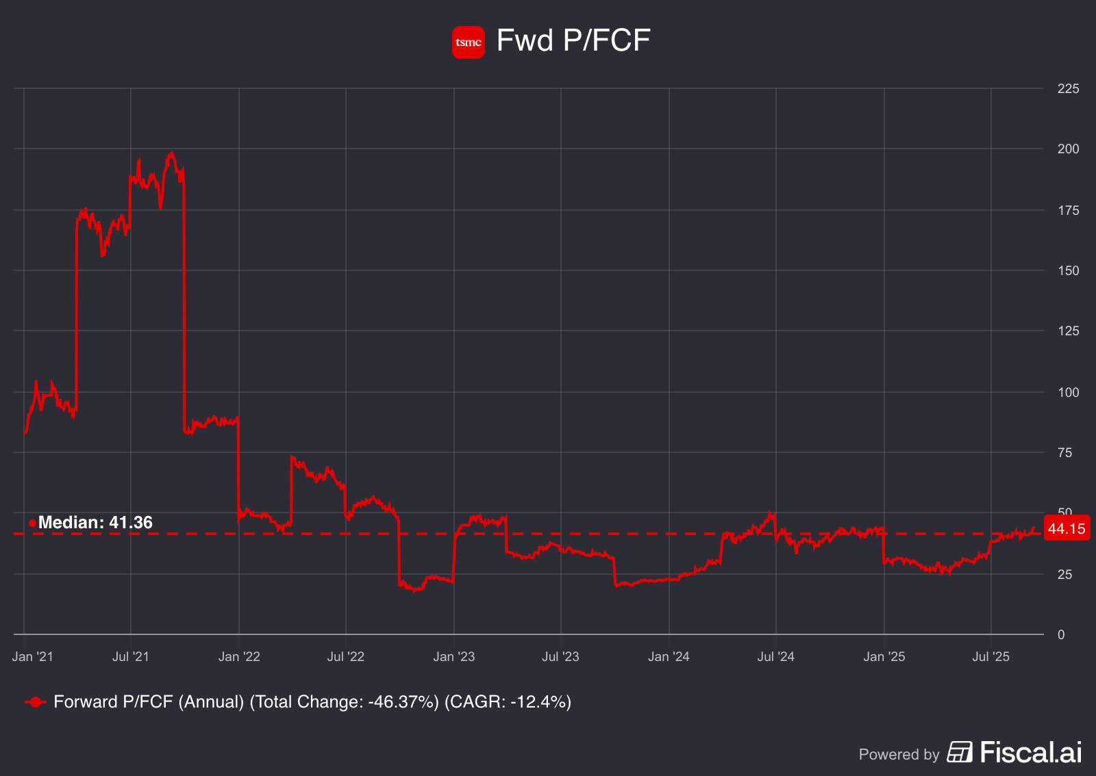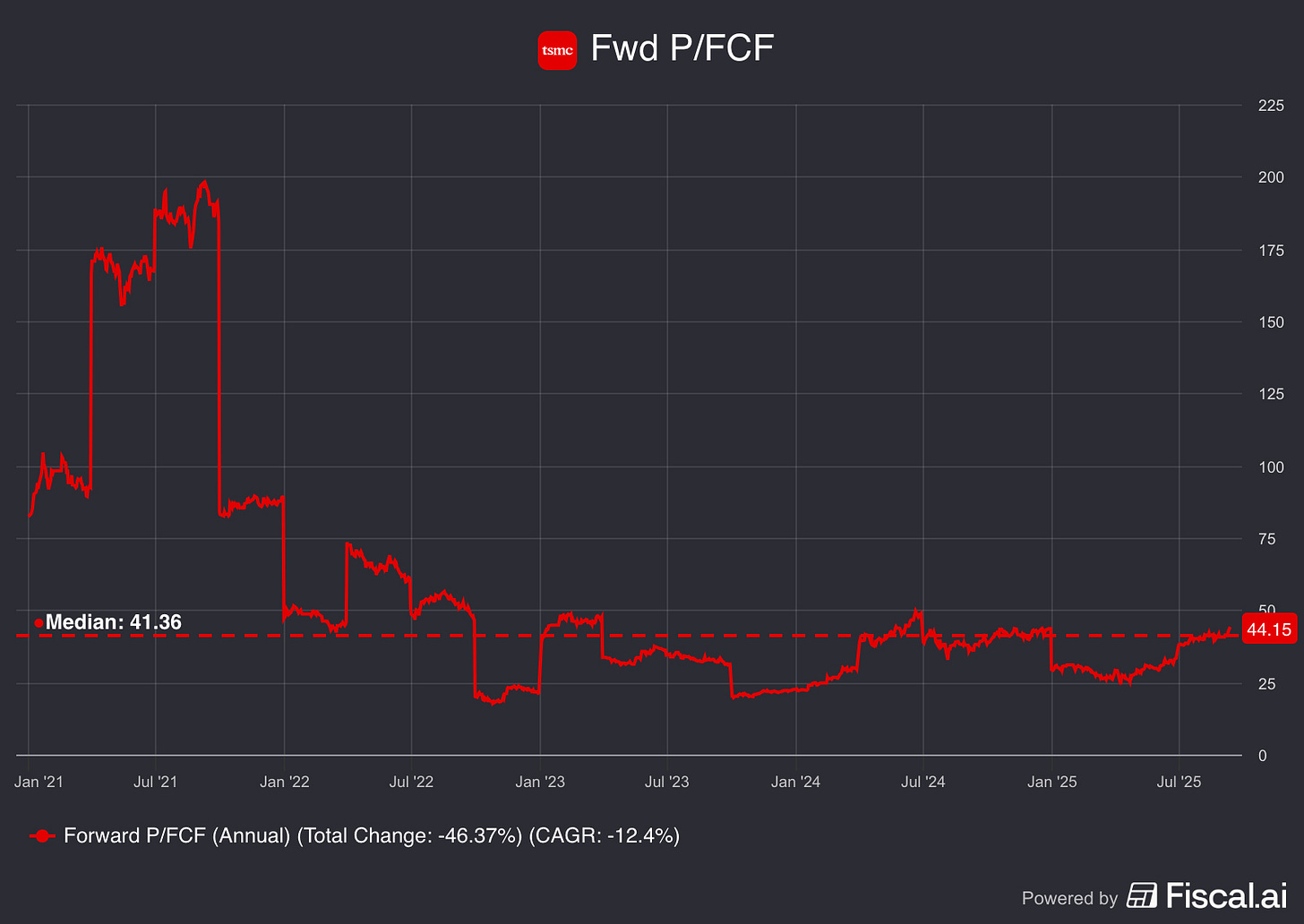 TSMC’s forward P/FCF is trading above its historical median, suggesting the stock may currently be overvalued based on this metric.