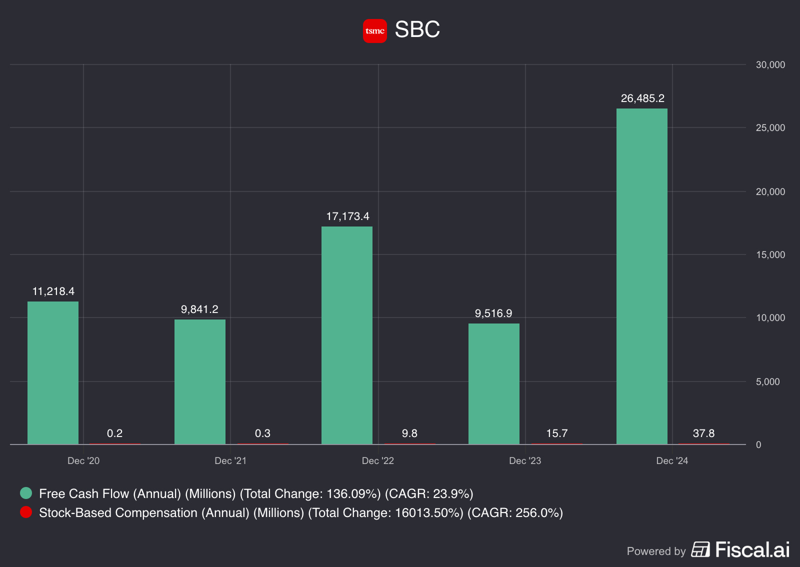 TSMC has been issuing Stock-Based Compensation (SBC), which impacts its reported free cash flow in a negative way and basically making free cash flow worthless. But, because there FCF is so huge in comparison, SBC doesn’t have an impact on their FCF.